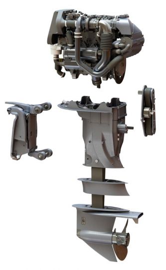 Nella parte posteriore una cinghia di grandi dimensioni collega l'uscita della biella al motore inferiore. Nel piede fuoribordo, un'altra cinghia, questa volta in bagno d'olio, aziona l'elica.