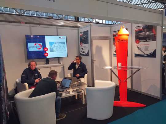 Allo stand Guelt si parla di chiglie e del Vendée Globe davanti a un caffè. Altre aziende francesi, come i fornitori di accessori e gli specialisti di materiali compositi, approfittano del salone per sondare l'interesse del mercato internazionale... tenendo d'occhio Parigi, dove presto si terrà il Salone Nautico di Parigi.